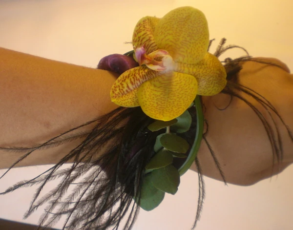 Galerie - Armreif 6 - Hochzeit - Blumen für Leipzig. Armreif 6 Beschreibung Accessoire::: Armreif mit Phaelenopsis Blüte, Pfauenfeder und Eucalypthus.