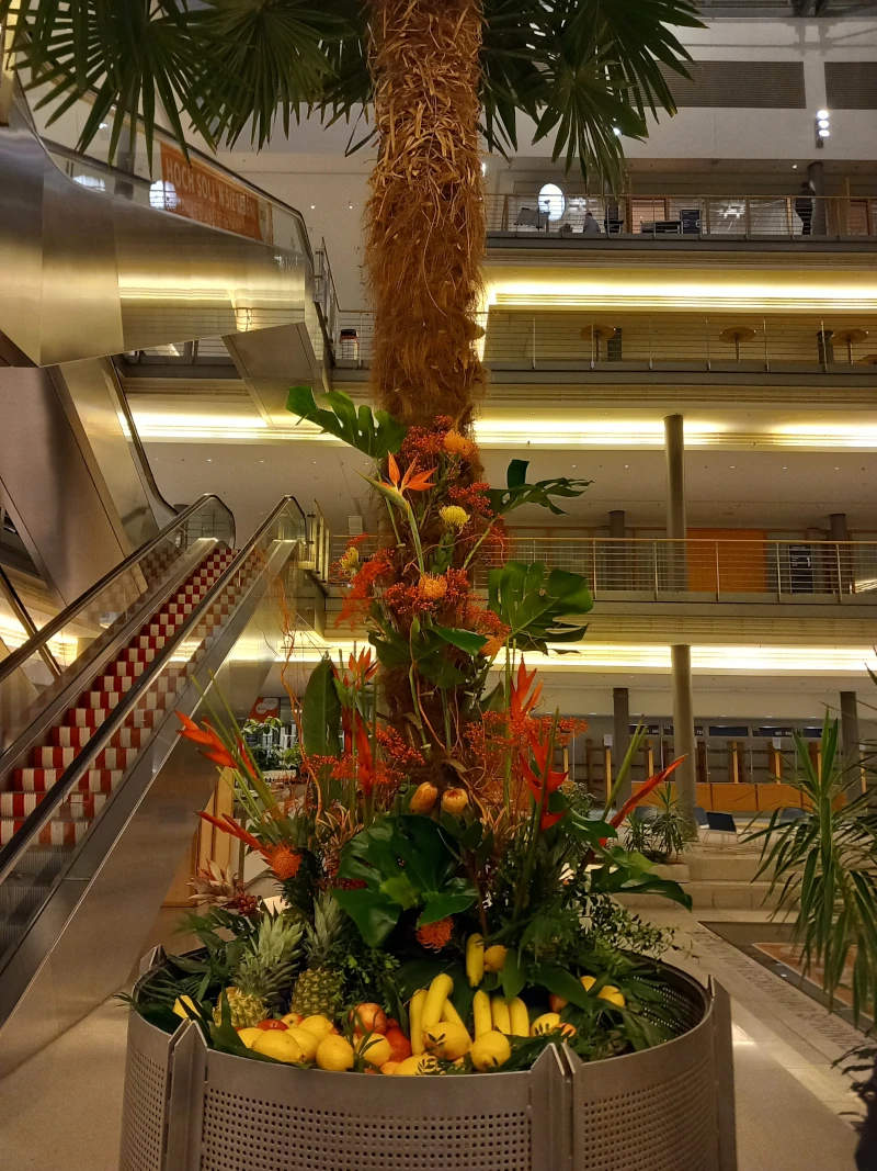 :: Palme mit verschiedenen Obstsorten geschmückt auf der Leipziger Messe.