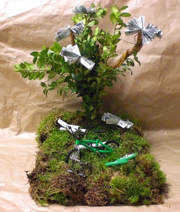 :: Gefaltete Geldscheine an einem Buchsbaumzweig als stilisierten Baum auf einem Mooskissen neben dem ein Fahrrad steht.
