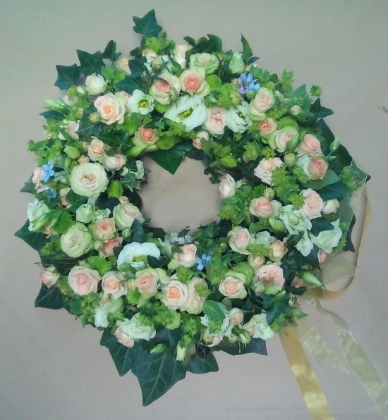 :: Trauerkranz mit Rosen, Eustoma, Oxypetalum, Bublerum und Efeublätter.